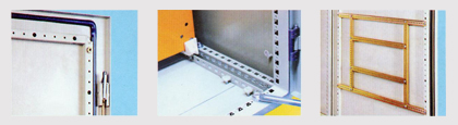 所有箱门和箱体后壁的弯边宽度为21mm。 暗铰链,不会突出在门框内和箱体中。箱门可开启130°。 箱门离地很高跃约25mm。 安装板可利用塑料滑引器通过导轨从正面推入箱内。 2.5mm厚的安装板,两边有23mm宽的C形弯边,使得安装板更牢固。 粉末涂装表面呈RAL7032织纹状。 箱底三块衬板,可以互相替换,移动方便,易于导入电缆,易于加工。 坚固的长方形框架可以用螺丝固定在箱门上,用来固定电缆、电缆束和压板等。 箱体上和门上都有地线连接螺丝,也可以卸掉。 |